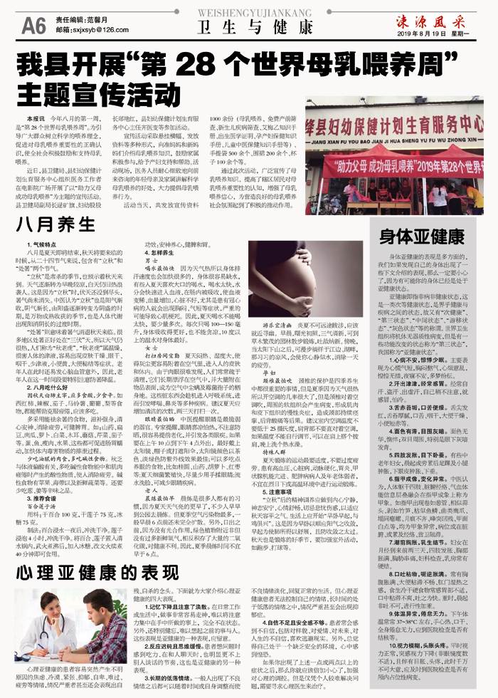 本报讯 今年八月的第一周,是“第28个世界母乳喂养周”。为引导广大群众树立科学的喂养理念,促进对母乳喂养重要性的正确认识,使全社会积极鼓励和支持母乳喂养。
