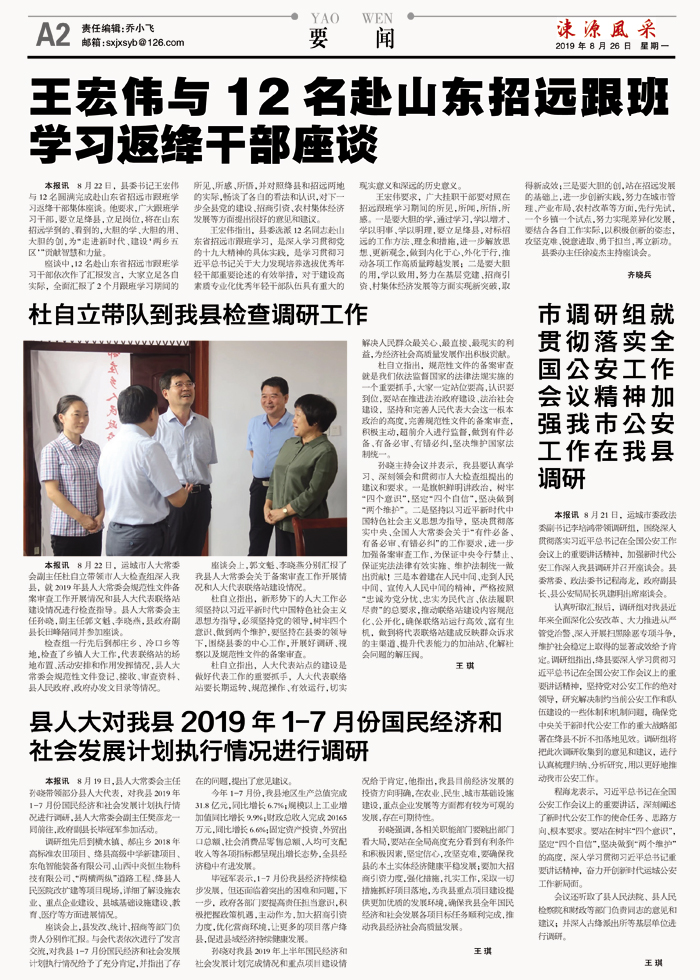 本报讯 8月19日,县人大常委会主任孙晓带领部分县人大代表,对我县2019年1-7月份国民经济和社会发展计划执行情况进行调研,县人大常委会副主任樊彦龙一同前往,政府副县长毕冠军参加活动。