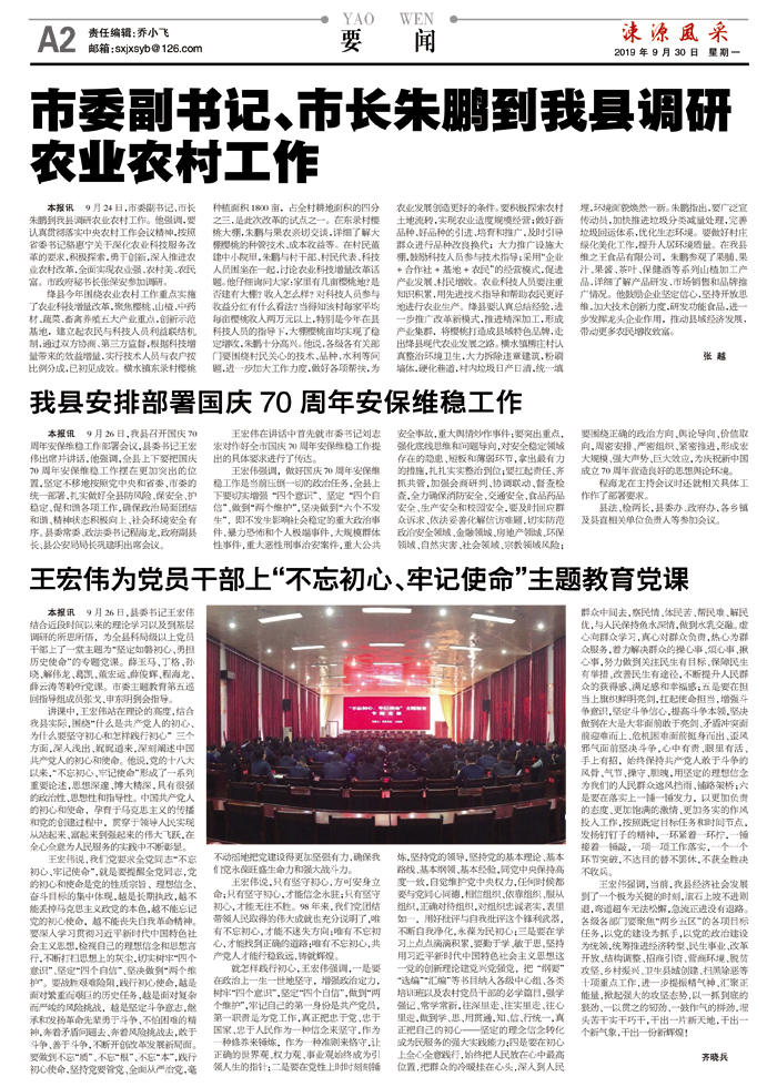 本报讯 9月26日,县委书记王宏伟结合近段时间以来的理论学习以及到基层调研的所思所悟,为全县科局级以上党员干部上了一堂主题为“坚定如磐初心、勇担历史使命”的专题党课。薛玉马、丁格、孙晓、解伟龙、葛凯、董宏运、薛俊辉、程海龙、薛云涛等聆听党课。市委主题教育第五巡回指导组成员张戈、申东明到会指导。
