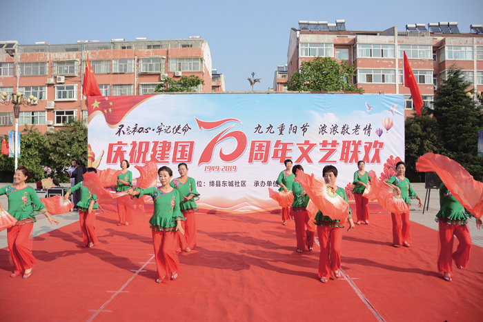 本报讯 9月30日,一场精彩的文艺节目在绛县飞龙花苑小区广场上演,绛县东城社区的干部职工和飞龙花苑的业主们载歌载舞,庆祝中华人民共和国成立70周年和重阳佳节的到来。