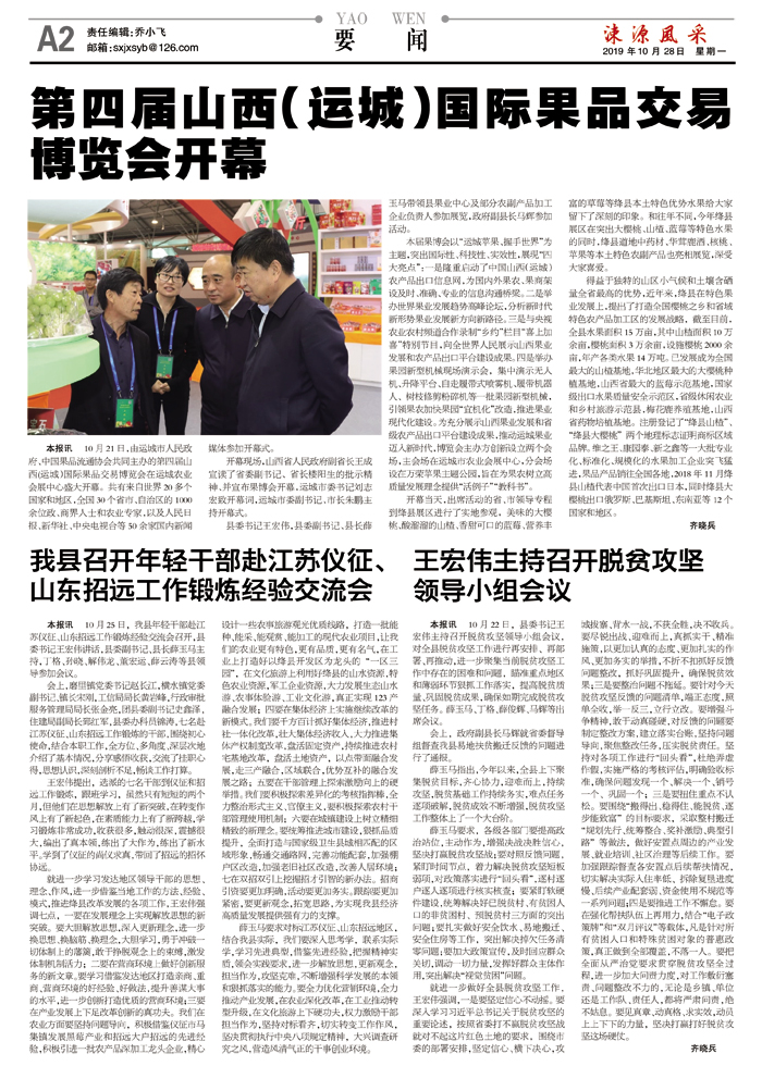 本报讯 10月25日,我县年轻干部赴江苏仪征、山东招远工作锻炼经验交流会召开,县委书记王宏伟讲话,县委副书记、县长薛玉马主持,丁格、孙晓、解伟龙、董宏运、薛云涛等县领导参加会议。