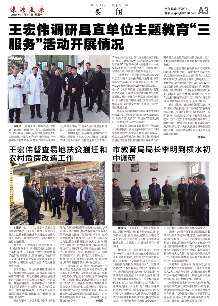 王宏伟强调,群众反映强烈的痛点、难点、堵点问题,就是我们“三服务”要解决的焦点问题。县直各职能部门要把开展“三服务”活动与完成部门工作目标任务紧密结合起来,把广大党员干部在主题教育中激发出的精气神,不断转化为推动工作的动力和活力,切实解决了一大批人民群众反映强烈的突出问题,让基层群众感受到了机关单位的新作风新形象。
