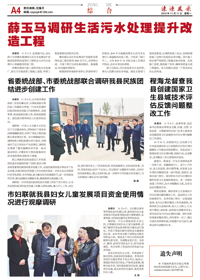 本报讯 11月4日,县委副书记、县长薛玉马到横水镇调研生活污水处理站扩容提质及管网改造项目工程和县生活污水处理中心保温提效改造工程。