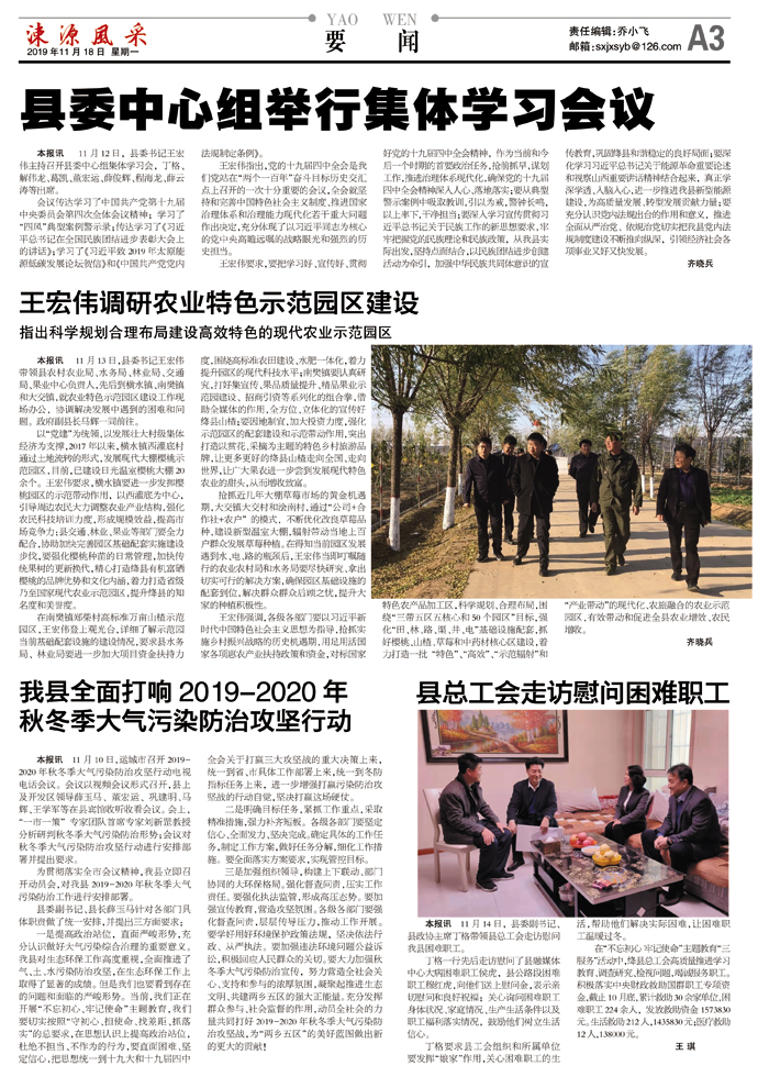 王宏伟要求,要把学习好、宣传好、贯彻好党的十九届四中全会精神,作为当前和今后一个时期的首要政治任务,抢前抓早,谋划工作,推进治理体系现代化,确保党的十九届四中全会精神深入人心、落地落实;要从典型警示案例中吸取教训,引以为戒,警钟长鸣,以上率下,干净担当;要深入学习宣传贯彻习近平总书记关于民族工作的新思想要求,牢牢把握党的民族理论和民族政策,从我县实际出发,坚持点面结合,以民族团结进步创建活动为牵引,加强中华民族共同体意识的宣传教育,巩固绛县和谐稳定的良好局面;要深化学习习近平总书记关于能源革命重要论述和视察山西重要讲话精神结合起来,真正学深学透、入脑入心,进一步推进我县新型能源建设,为高质量发展、转型发展贡献力量;要充分认识党内法规出台的作用和意义,推进全面从严治党、依规治党切实把我县党内法规制度建设不断推向纵深,引领经济社会各项事业又好又快发展。