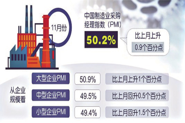 国家统计局服务业调查中心、中国物流与采购联合会11月30日联合发布数据,11月份,中国制造业采购经理指数(PMI)为50.2%,比上月上升0.9个百分点,在连续6个月低于50%的临界点后,再次回到扩张区间。