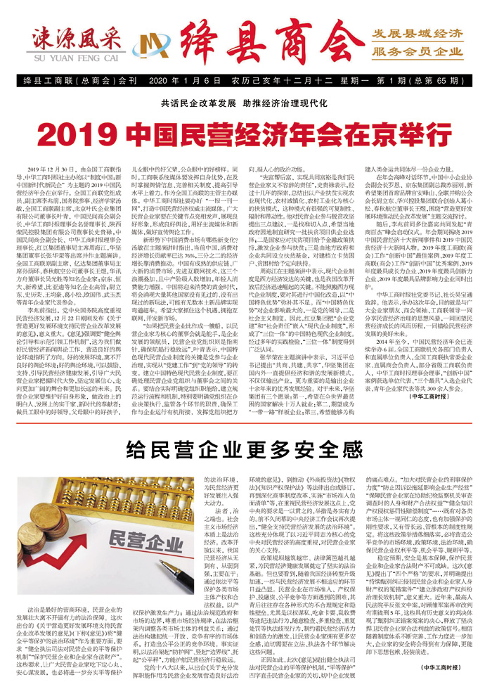 2019年12月30日,由全国工商联指导、中华工商时报社主办的以“制度中国:新中国新时代新民企”为主题的2019中国民营经济年会在京举行。全国工商联党组成员、副主席李兆前,国务院参事、经济学家汤敏,全国工商联副主席、北京叶氏企业集团有限公司董事长叶青,中国民间商会副会长、中华工商时报理事会名誉理事长、陕西荣民控股集团有限公司董事长史贵禄,中国民间商会副会长、中华工商时报理事会理事长、红豆集团董事局主席周海江,华坚集团董事长张华荣等出席并作主题演讲。全国工商联原副主席、亿达集团董事局主席孙荫环,春秋航空公司董事长王煜,华讯方舟董事长吴光胜等知名企业家;京东、恒大、新希望、比亚迪等知名企业高管;尉立东、史历荣、王均豪、葛小松、欧国伟、武玉杰等青年企业家代表参会。