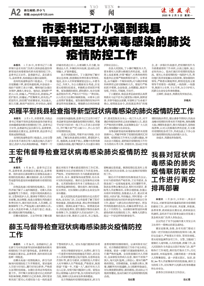 邓雁平到我县检查指导新型冠状病毒感染的肺炎疫情防控工作