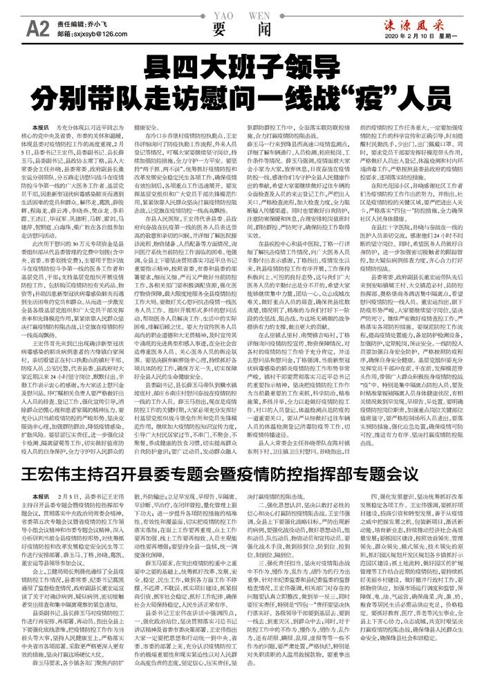 本报讯 为充分体现以习近平同志为核心的党中央及省委、市委的关怀和温暖,体现县委对疫情防控工作的高度重视,2月5日,县委书记王宏伟,县委副书记、县长薛玉马,县委副书记、县政协主席丁格,县人大常委会主任孙晓,县委常委、政府副县长董宏运分别带队,分五路走访慰问战斗在疫情防控斗争第一线的广大医务工作者、基层党员干部,因患新型冠状病毒感染肺炎而遇到生活困难的党员和群众。解伟龙、葛凯、薛俊辉、程海龙、薛云涛、李晓燕、樊彦龙、李彩霞、王述江、毕冠军、巩建明、马辉、霍剑、马建萍、贺照庭、白海珠、柴广胜在各自组参加走访慰问活动。