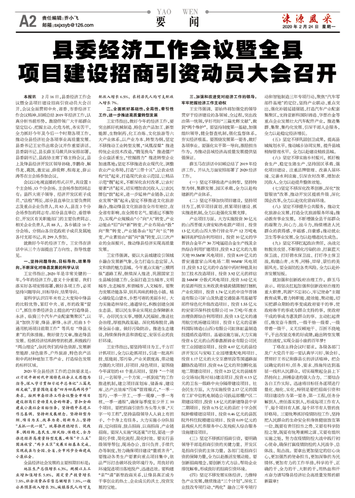 本报讯 2月16日,县委经济工作会议暨全县项目建设招商引资动员大会召开,会议全面贯彻中央、省委、市委经济工作会议精神,回顾总结2019年经济工作,认真分析当前形势,激励带领广大干部群众坚定信心、把握主动,化危为机、务实苦干,全力抓好今年及今后一个时期各项工作,推动全县经济社会各项事业高质量发展。县委书记王宏伟出席会议并作重要讲话,县委副书记、县长薛玉马做具体安排部署,县委副书记、县政协主席丁格主持会议,县上及绛县经济开发区领导孙晓、李鹏奇、解伟龙、葛凯、董宏运、薛俊辉、程海龙、薛云涛等在主会场参加会议。