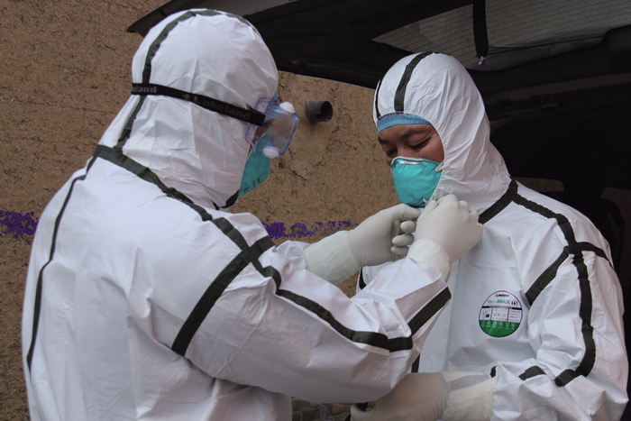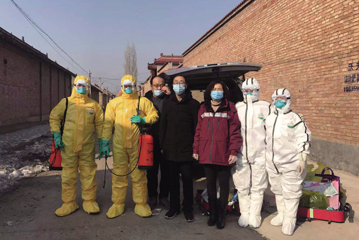 9∶00 分管副主任周迎敏和消杀队队长秦新胜、队员李俊、杨俊在大厅检点消杀器具,配制消杀药品,准备前往确诊病例家进行消杀。确诊病例许某家在距离县城10公里的古绛镇白家涧村。这一次前往确诊病例家中消毒,与可能存在的新冠病毒零距离接触,对大家的心理是一个极大的挑战和考验。新冠病毒传染的强度和烈度,作为疾控工作者,队员们比谁都清楚,之前武汉发生的医护人员被感染的悲剧,更给队员们内心增加了巨大的压力。配置药品的过程中,大家都默不作声。准备工作很快就完成了,周迎敏副主任看着大家,说了一句话:职责和使命所系,我们必须逆向前行。不求最美逆行者,但做无愧疾控人。