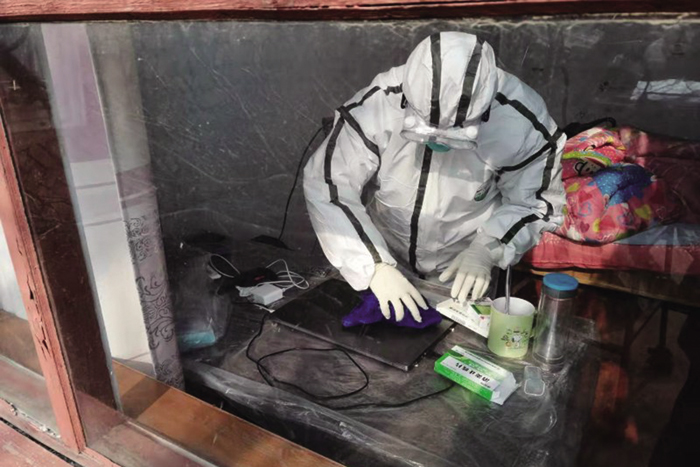 10∶00 消杀队来到了确诊患者许某的家中。许某的家中只有父母两位老人。母亲因病瘫痪在床,父亲因刚动完尿结石手术插着尿管行动不便。患者的姐姐、姐夫及外甥女在县城集中医学场所隔离观察。老人的日常生活需求由村委主任料理。