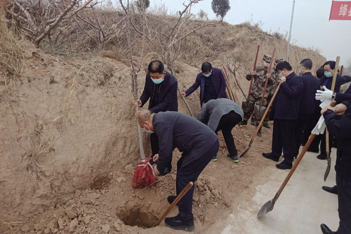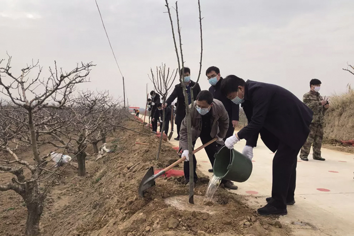 活动中,王宏伟、薛玉马等县领导互相配合,扶正苗木、挥铁铲土,堆起围堰、提桶浇水,每道工序都做得认真细致。在县领导的带领下,现场的干部群众热情高涨、干劲十足,短短不到一个小时的时间,1200多棵西府海棠和樱花树就栽植完毕,迎风挺立。