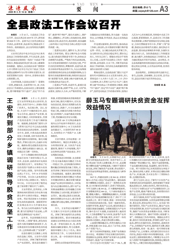 二是要突出重点,履职有为,努力开创政法工作新局面;要全力维护社会大局稳定;强力推进扫黑除恶专项斗争;加快社会治理现代化进程;严格执行相关法律法规,加大对危害疫情防控行为的查处力度,严厉打击抗拒疫情防控,聚集闹事、造谣传谣、扰乱市场秩序等违法犯罪行为,为全县统筹推进疫情防控和经济社会发展提供保障;全力服务经济高质量转型发展;持续深化政法系统“放管服”改革,要着力维护创新发展,要全面推进执法司法公开。