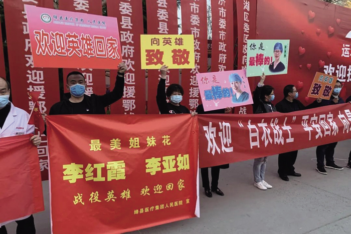 本报讯 春暖花已开,阳春凯歌奏。3月23日,运城市支援湖北的首批103名医护人员圆满完成救治任务,于13点左右到达太原。随后绛县人民医院支援湖北天门的急诊科护士长李红霞、重症医学科护师李亚如”乘坐运城市委市政府专派大巴于晚20时许顺利返回运城。绛县副县长董洪运、绛县卫生健康体育局局长荆晨亮、绛县医疗集团人民医院院长樊柳龙等一同前往运城迎接平安凯旋的队员们。