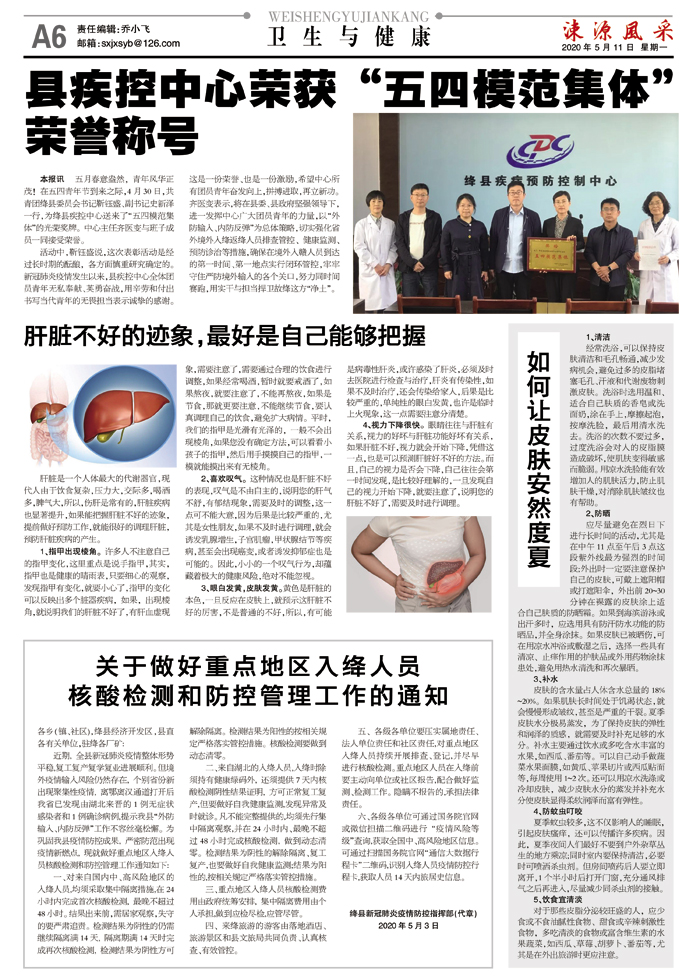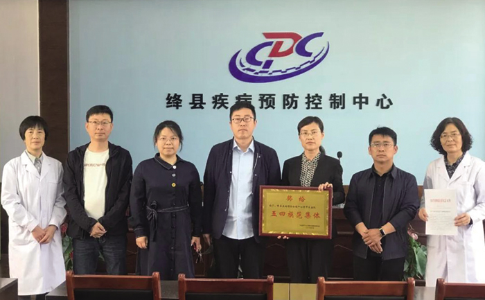 本报讯 五月春意盎然,青年风华正茂!在五四青年节到来之际,4月30日,共青团绛县委员会书记靳钰盛、副书记史新泽一行,为绛县疾控中心送来了“五四模范集体”的光荣奖牌。中心主任齐医变与班子成员一同接受荣誉。
