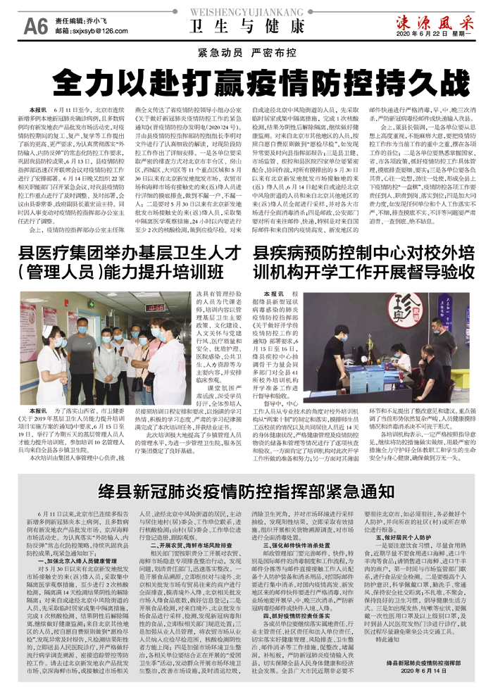 本报讯 6月11日至今,北京市连续新增多例本地新冠肺炎确诊病例,且多数病例均有新发地农产品批发市场活动史,对疫情防控期间的复工、复产、复学等工作提出了新的更高、更严要求,为认真贯彻落实“外防输入、内防反弹”的常态化防控工作要求,巩固我县防控成果,6月13日,县疫情防控指挥部迅速召开联席会议对疫情防控工作进行了安排部署。6月14日晚又组织22家相关职能部门召开紧急会议,对我县疫情防控工作重点进行了及时调整、及时部署,会议由县委常委、政府副县长董宏运主持。同时因人事变动对疫情防控指挥部办公室主任进行了调整。