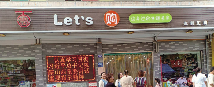 去年秋天,店面进行了一次大的装修,打开了正门两边封闭的墙体,换成了落地玻璃橱窗,店名换成了百惠超市统一的“百惠·Let’s购——生鲜汇店”。此举令店内的视野一下拓宽了不少。顾客在店外就可以看到店内琳琅满目的商品,店门旁边装上了电子屏幕,滚动播放着店里的优惠信息,间或发布一些重要通知,既为店内活动做了宣传又合理利用了空间。