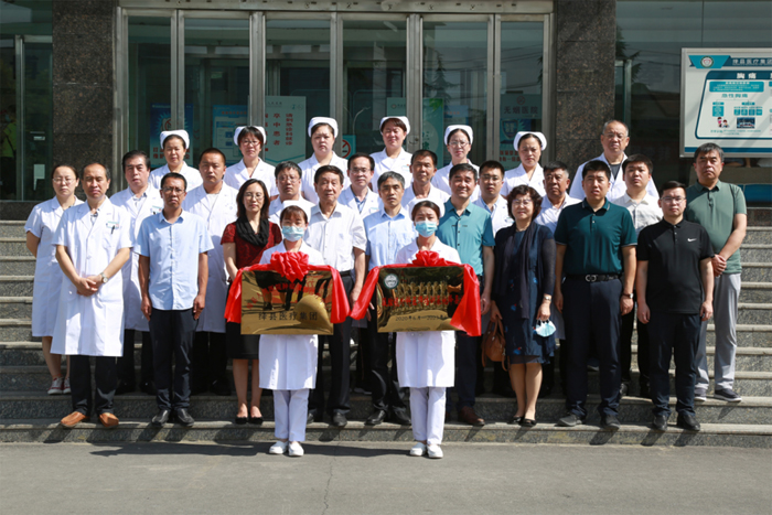 绛县卫健局党组书记陈燕向绛县人民医院副院长荣发家授“绛县人民医院肿瘤微创诊疗中心”铜牌。