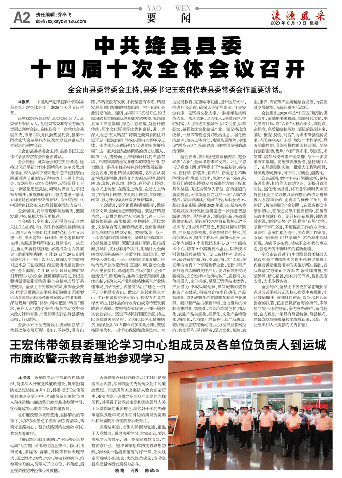 本报讯 中国共产党绛县第十四届委员会第十次全体会议于2020年8月6日召开。