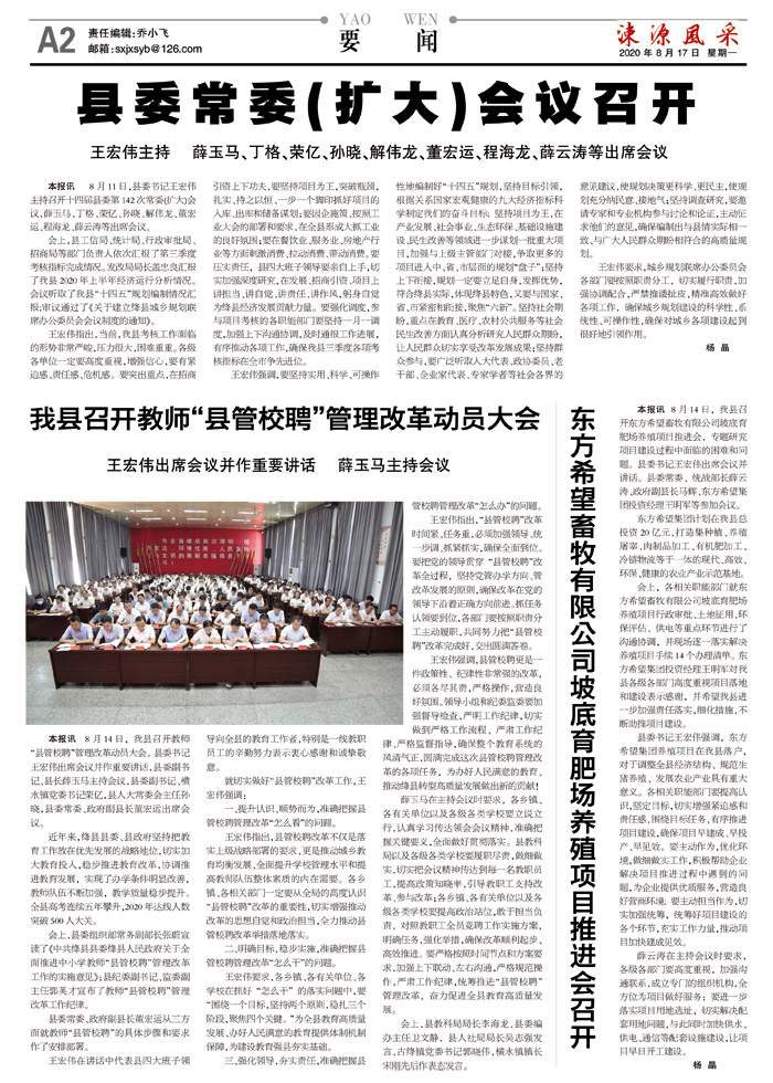 本报讯 8月11日,县委书记王宏伟主持召开十四届县委第142次常委(扩大)会议,薛玉马、丁格、荣亿、孙晓、解伟龙、董宏运、程海龙、薛云涛等出席会议。