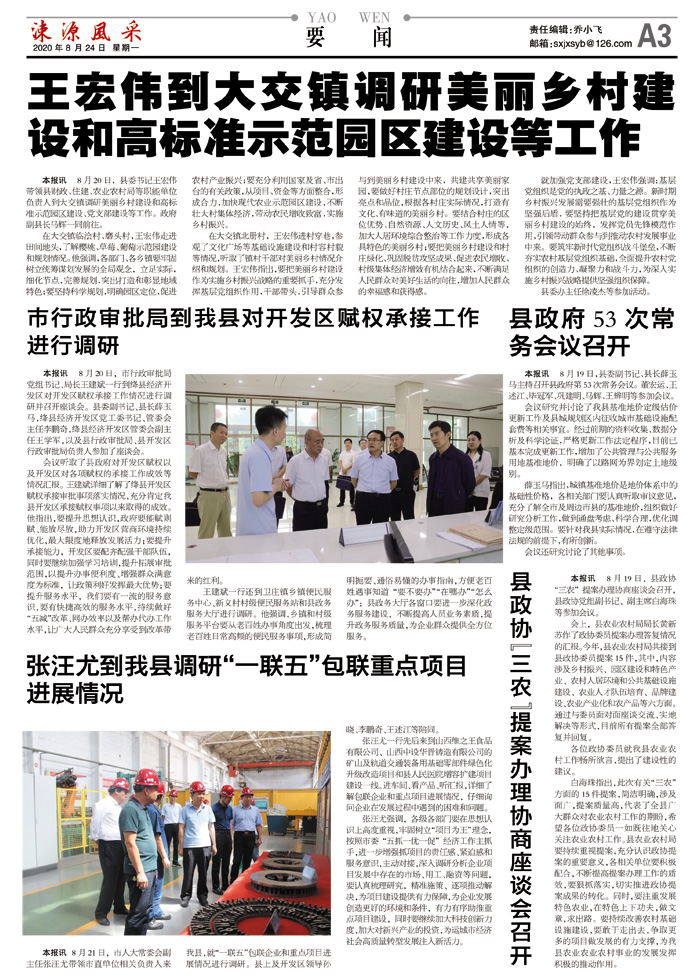 王宏伟到大交镇调研美丽乡村建设和高标准示范园区建设等工作