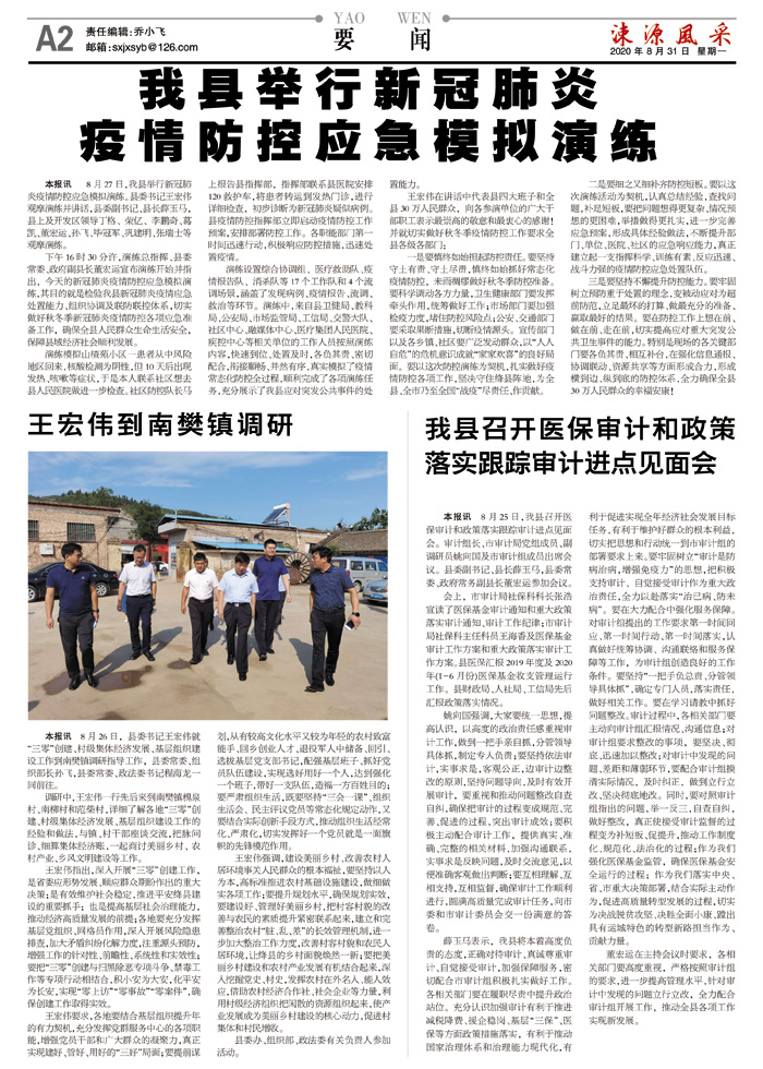 本报讯 8月26日,县委书记王宏伟就“三零”创建、村级集体经济发展、基层组织建设工作到南樊镇调研指导工作,县委常委、组织部长孙飞,县委常委、政法委书记程海龙一同前往。