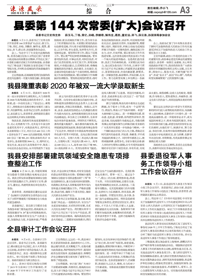 本报讯 9月3日,县委书记王宏伟主持召开县委第144次常委(扩大)会议。薛玉马、丁格、荣亿、孙晓、李鹏奇、解伟龙、葛凯、董宏运、孙飞、薛云涛、孙国强等参加会议。