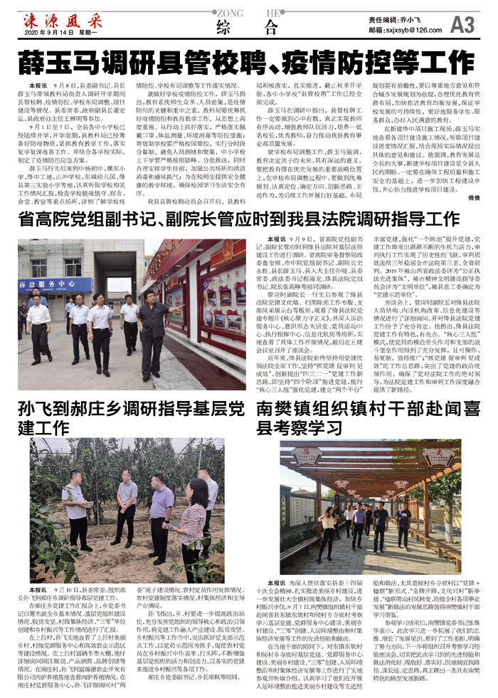 薛玉马行先后来到中杨初中,横东小学,绛中工地,山冲学校,东城幼儿园,绛县第三实验小学等地,认真听取学校相关工作情况汇报,检查学校值班值守、宿舍、食堂、教室等重点场所,详细了解学校疫情防控、学校布局调整等工作落实情况。