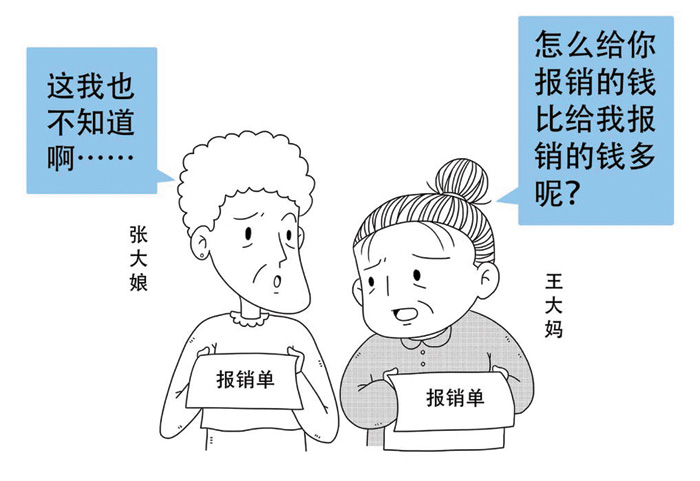 答14:因为张大娘参加的是城乡居民医疗保险, 王大妈参加的是职工基本医疗保险,两个人参加的是不同类型的医保。由于职工基本医疗保险与城乡居民医疗保险这两个险种在参保和筹资上有差别,职工医疗保险年均缴费要几千元,居民医疗保险年人均缴费只有几百元,报销待遇不同,所以报销的费用也不同。