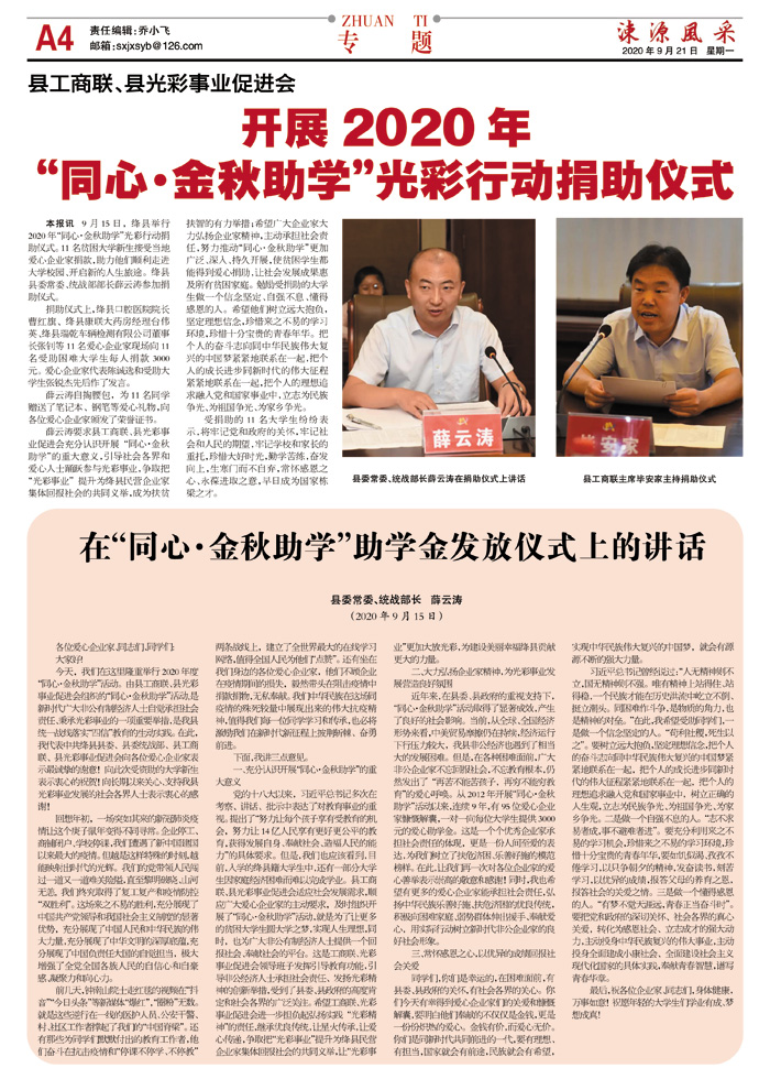 在“同心·金秋助学”助学金发放仪式上的讲话