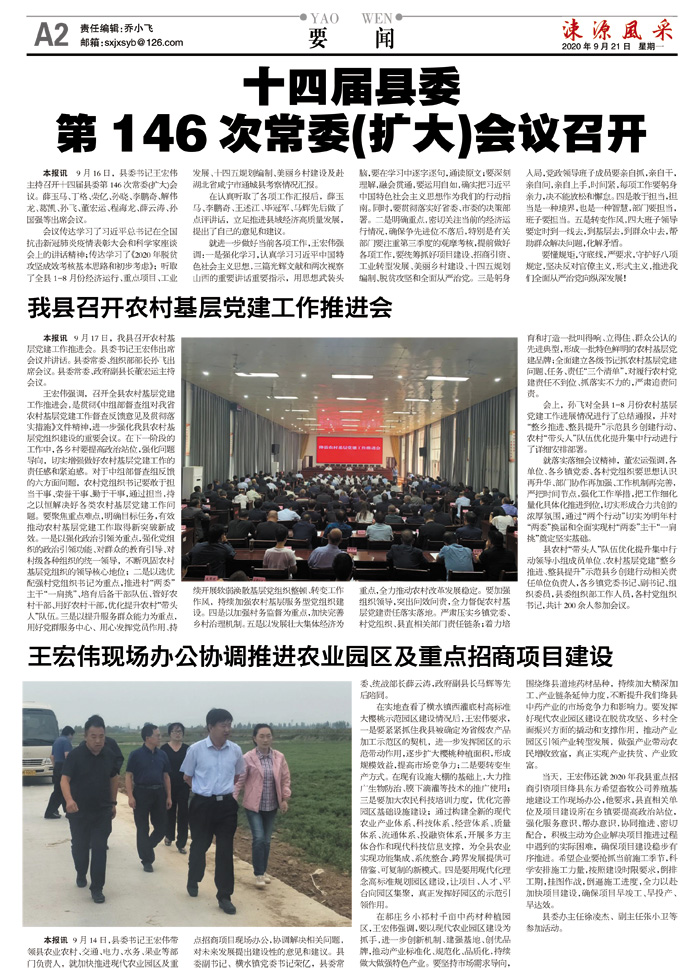 会议传达学习了习近平总书记在全国抗击新冠肺炎疫情表彰大会和科学家座谈会上的讲话精神;传达学习了《2020年脱贫攻坚成效考核基本思路和初步考虑》;听取了全县1-8月份经济运行、重点项目、工业发展、十四五规划编制、美丽乡村建设及赴湖北省咸宁市通城县考察情况汇报。