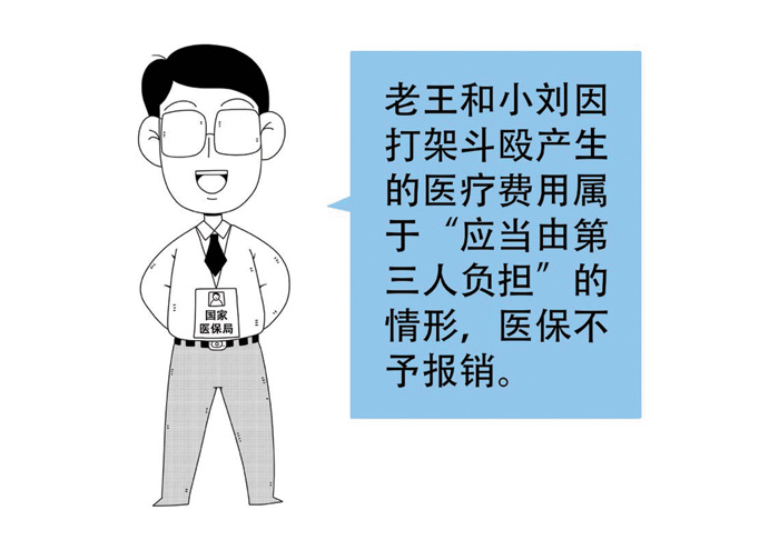 (四)在境外就医的。老王和小刘虽然属于医疗保险的参保人群,但两人因打架斗殴产生的医疗费用属于上述不纳入基本医疗保险基金支付范围的“应当由第三人负担的”情形,因此不能予以基本医疗保险基金报销。