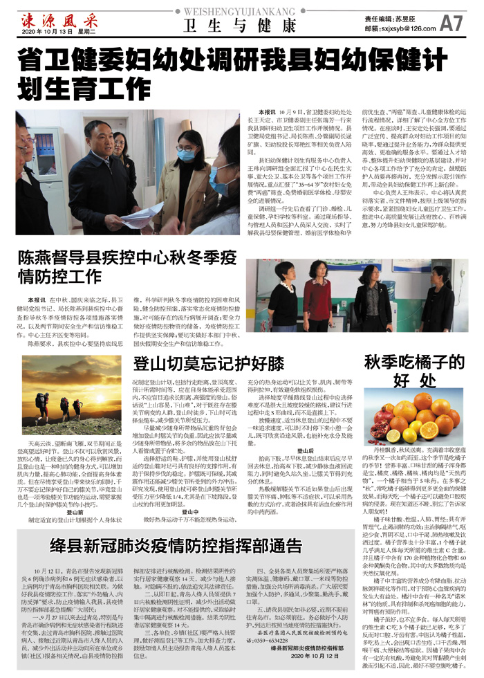 本报讯 10月9日,省卫健委妇幼处处长王天定、市卫健委副主任张瑞芳一行来我县调研妇幼卫生项目工作开展情况。县卫健局党组书记、局长陈燕、分管副局长逯矿旗、妇幼股股长郑艳红等相关负责人陪同。