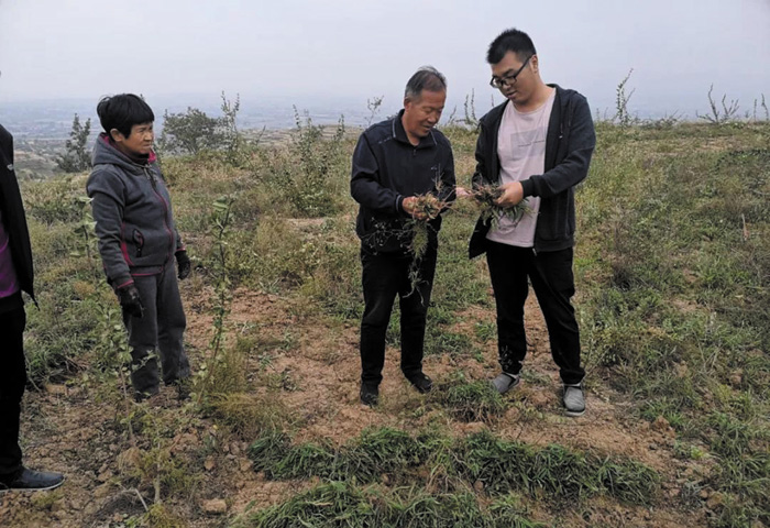 绛县人民医院驻山底坡村第一书记徐森和村干部在查看柴胡的生长情况。 裴旭薇 摄