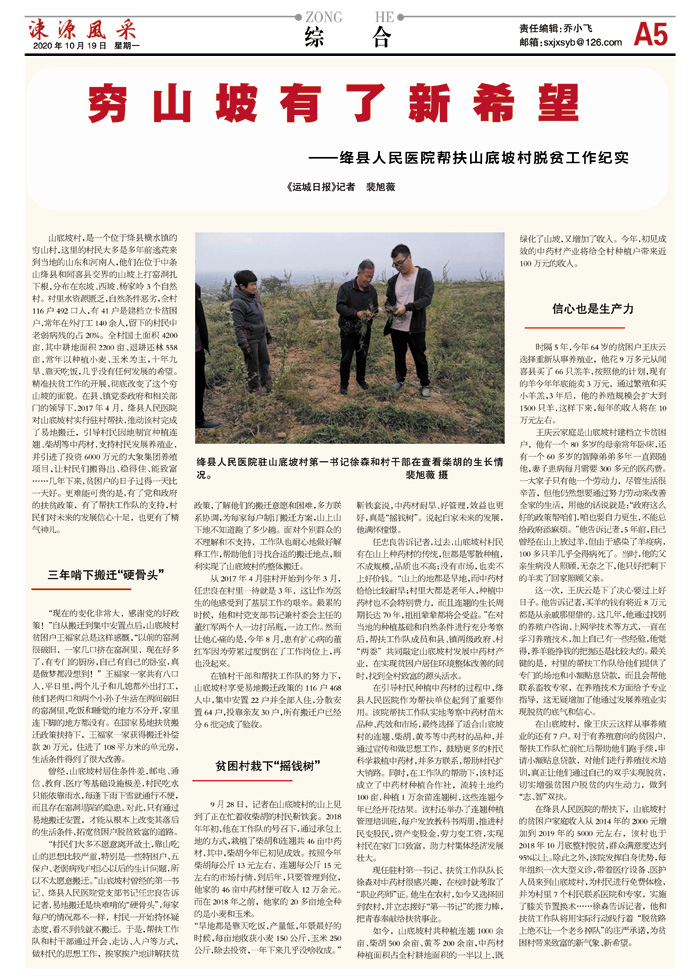 山底坡村,是一个位于绛县横水镇的穷山村,这里的村民大多是多年前逃荒来到当地的山东和河南人,他们在位于中条山绛县和闻喜县交界的山坡上打窑洞扎下根,分布在东坡、西坡、杨家岭3个自然村。村里水资源匮乏,自然条件恶劣,全村116户492口人,有41户是建档立卡贫困户,常年在外打工140余人,留下的村民中老弱病残的占20%。全村国土面积4200亩,其中耕地面积2200亩、退耕还林558亩,常年以种植小麦、玉米为主,十年九旱、靠天吃饭,几乎没有任何发展的希望。精准扶贫工作的开展,彻底改变了这个穷山坡的面貌。在县、镇党委政府和相关部门的领导下,2017年4月,绛县人民医院对山底坡村实行驻村帮扶,推动该村完成了易地搬迁,引导村民因地制宜种植连翘、柴胡等中药材,支持村民发展养殖业,并引进了投资6000万元的大象集团养殖项目,让村民们搬得出、稳得住、能致富……几年下来,贫困户的日子过得一天比一天好。更难能可贵的是,有了党和政府的扶贫政策,有了帮扶工作队的支持,村民们对未来的发展信心十足,也更有了精气神儿。