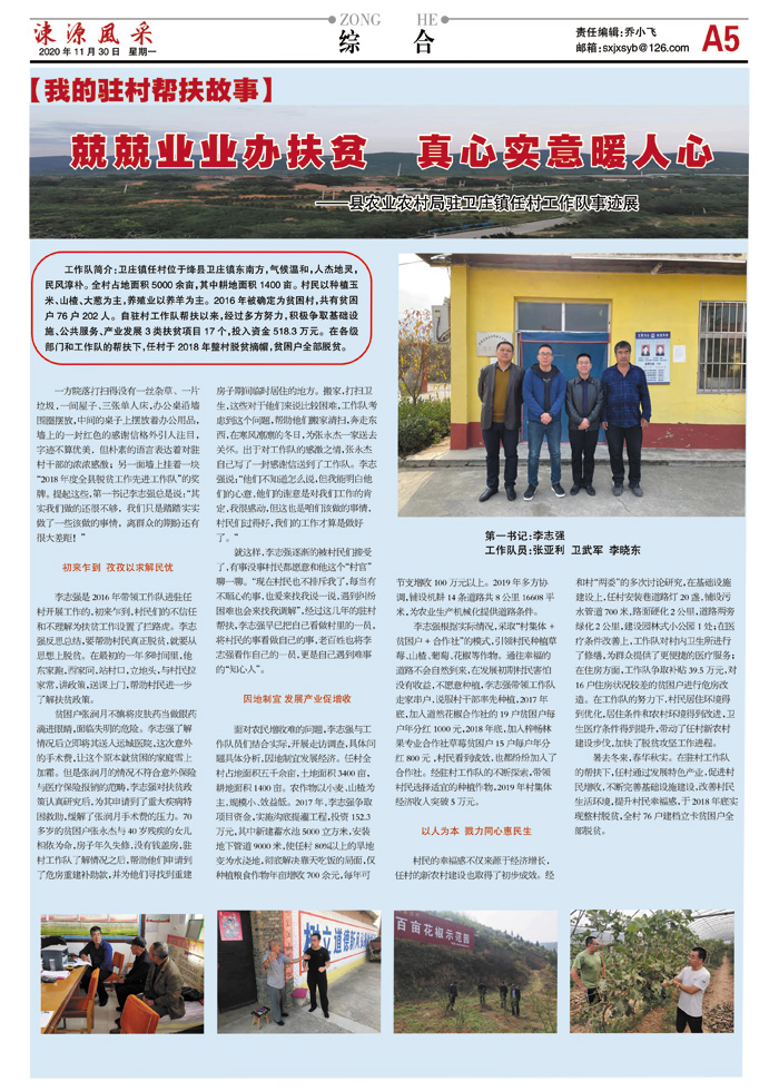 工作队简介:卫庄镇任村位于绛县卫庄镇东南方,气候温和,人杰地灵,民风淳朴。全村占地面积5000余亩,其中耕地面积1400亩。村民以种植玉米、山楂、大葱为主,养殖业以养羊为主。2016年被确定为贫困村,共有贫困户76户202人。自驻村工作队帮扶以来,经过多方努力,积极争取基础设施、公共服务、产业发展3类扶贫项目17个,投入资金518.3万元。在各级部门和工作队的帮扶下,任村于2018年整村脱贫摘帽,贫困户全部脱贫。