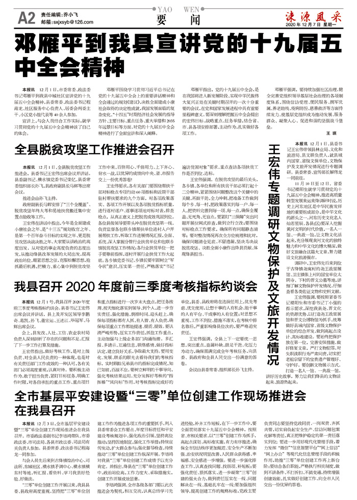 邓雁平指出,党的十九届五中全会,是在我国将进入新发展阶段、实现中华民族伟大复兴正处在关键时期召开的一次十分重要的会议,在党和国家发展进程中具有重要里程碑意义。要深刻理解把握五中全会提出的宏伟目标、战略重点、任务举措,结合省、市、县各项安排部署,主动作为,扎实做好各项工作。
