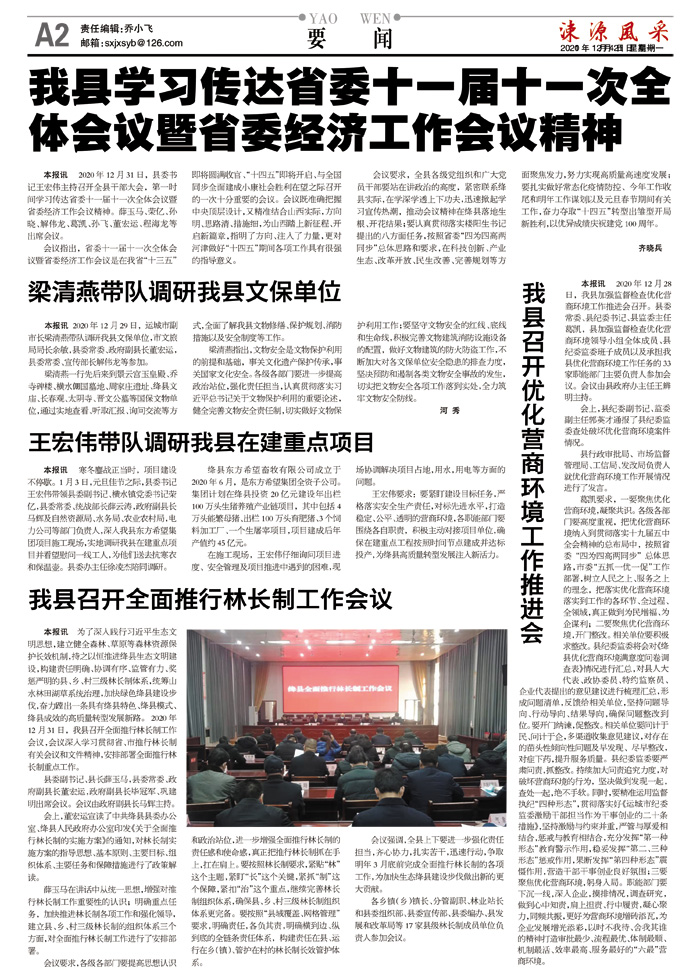 本报讯 2020年 12月29日,运城市副市长梁清燕带队调研我县文保单位,市文旅局局长余敏,县委常委、政府副县长董宏运,县委常委、宣传部长解伟龙等参加。