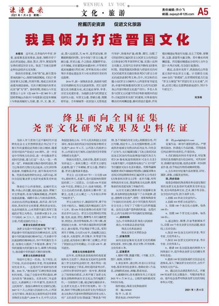 本报讯 近年来,众多海内外专家、学者、旅客慕名前来绛县,探索、领略珍存于此的晋国遗址、遗迹、景点、图书、展览馆等宝贵的晋国历史文化,促进了当地文旅事业和社会经济长足发展。