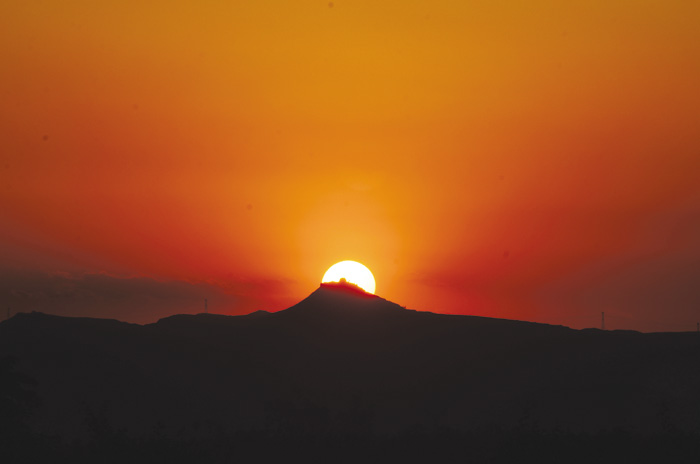 黎明时分,正当繁星隐退,人们酣睡之际,更加辉煌的胜景已悄然降临。此时此刻,天山空阔,青碧相映;天连远山,峰接遥天。高低天山无间,上下青碧分明。须臾间,东方天山相接处便开始发生神奇的变化。先是出现了灰蒙蒙的云雾,云雾慢慢由灰变白,由白变成鹅黄。最后变成了绚丽的五色云霞。就在这时,太阳从云霞后边升起来了,形状由镰刀形逐渐变为圆盘形,颜色由金黄、桔黄逐渐变为桃红、血红、朱红,越来越明亮,越来越鲜艳,这时的太阳虽然不断变化,但却丝毫不刺眼,任凭你尽情地欣赏观看,它会使您忘却一切,陶醉在无比的幸福之中。如果你要拍摄,就抓住时机,留住这绚丽的镜头。霎时,那鲜艳欲滴的红日便撩去纱巾,露出白里透红的面庞,含情脉脉地流泻出柔和迷人的光彩。