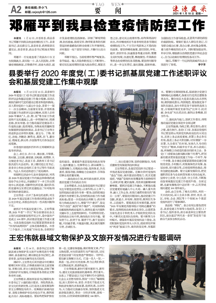 邓雁平一行实地查看了我县冷口乡卫生院隔离点、县实验一小、县人民医院、古绛镇疫情指挥部、古绛镇乔村、波音大酒店、超市及县疫情防控指挥部,详细了解疫情检测、防控措施、值班安排、物资配备和防控新型冠状病毒感染的肺炎疫情工作开展情况,并对基层一线干部坚守岗位、辛勤付出表示问候。