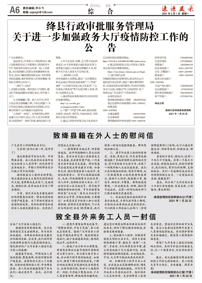 绛县行政审批服务管理局关于进一步加强政务大厅疫情防控工作的公告