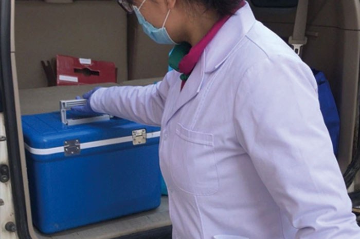 检验科同事到各个隔离点取到核酸样本,并送往市级进行检测