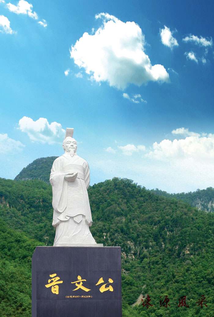 晋文公,姓姬名重耳,(前697——628)晋献公诡诸之次子。博览群书,学识超群,贤名鹊起。20岁时,因受献公宠妃骊姬的陷害,在狐偃、赵衰、先轸、贾佗等人的陪从下,先后到过狄、卫、曹、郑、楚等10多个国家流亡避难,历尽千辛万苦,饱尝世态炎凉。19年后的前636年,62岁的重耳在秦穆公的帮扶下,登上国君之位。在短短8年的执政时间里,以处惊不惊的坚强意志、忍辱负重的执着精神、审时度势的远见卓识、高瞻远瞩的治国方针,创造了我国古代历史上罕见的奇迹,使晋国在众多诸侯国激烈竞争中脱颖而出,成为当时经济最富有、军事最强盛、疆域面积最大的霸主国家,开创了晋国长达160年的辉煌霸权。