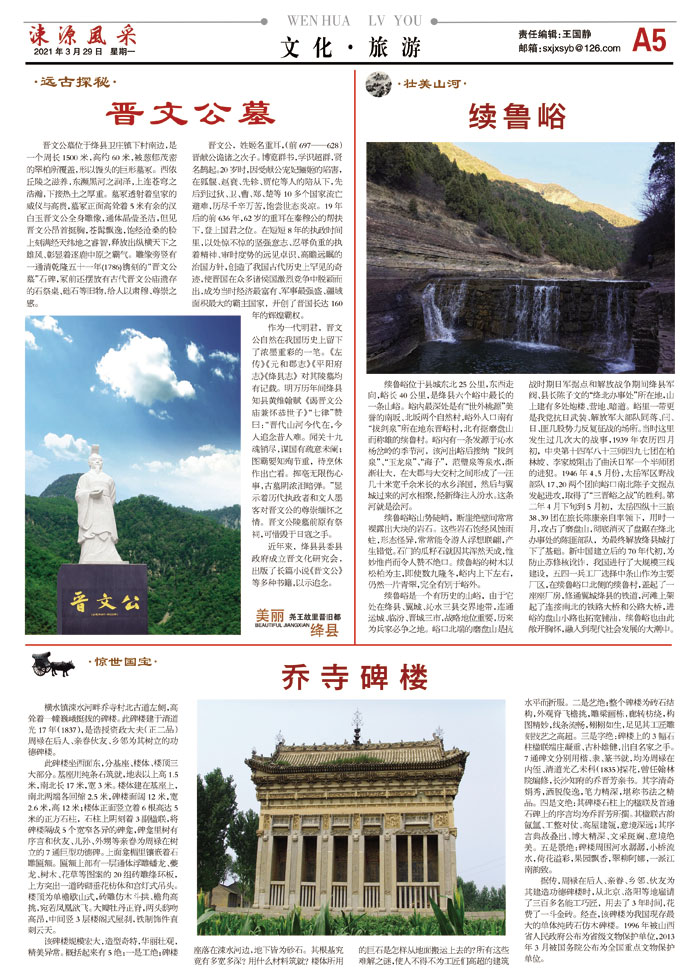 作为一代明君,晋文公自然在我国历史上留下了浓墨重彩的一笔。《左传》《元和郡志》《平阳府志》《绛县志》对其陵墓均有记载。明万历年间绛县知县黄维翰赋《谒晋文公庙兼怀恭世子》“七律”赞曰:“晋代山河今代在,今人追念昔人难。闻关十九魂销尽,谋国有疏意未阑;图霸要知殉节重,待烹休作出亡看。挥毫无限伤心事,古墓阴浓泪暗弹。”显示着历代执政者和文人墨客对晋文公的尊崇缅怀之情。晋文公陵墓前原有祭祠,可惜毁于日寇之手。