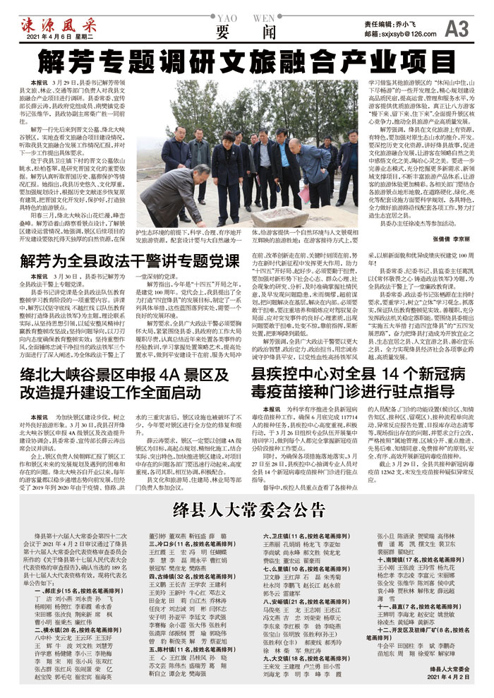解芳指出,今年是“十四五”开局之年,是建党100周年。党代会上,我县提出了全力打造“四宜绛县”的发展目标,制定了一系列具体举措,这些蓝图落到实处,需要一个良好的发展环境。