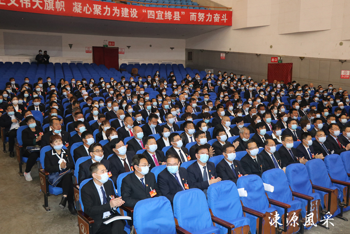 绛县会堂气氛庄重热烈,主席台帷幕正中央的国徽在两侧红旗映衬下熠熠生辉。