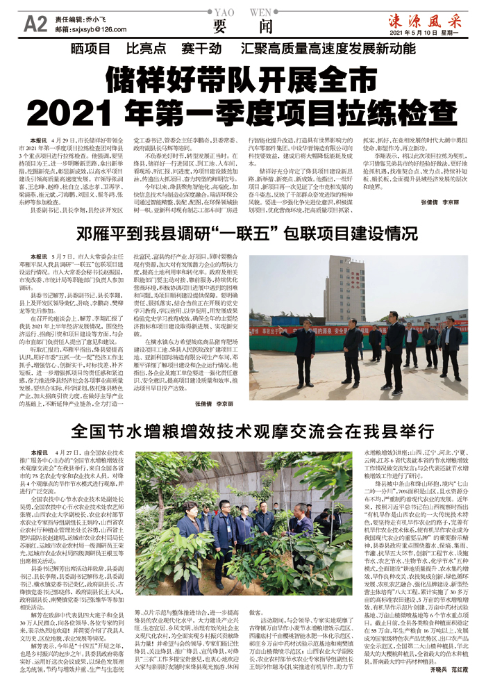 本报讯 4月29日,市长储祥好带领全市2021年第一季度项目拉练检查团对绛县3个重点项目进行拉练检查。他强调,要坚持项目为王,进一步明晰新思路,拿出新举措,挖掘新亮点,彰显新成效,以高水平项目建设引领高质量高速度发展。市领导张润喜、王志峰、赵晔、杜自立、潘志孝、卫再学、梁清燕、崔元斌、刁海鹏、刘国义、翟冬鸿、张东婷等参加检查。