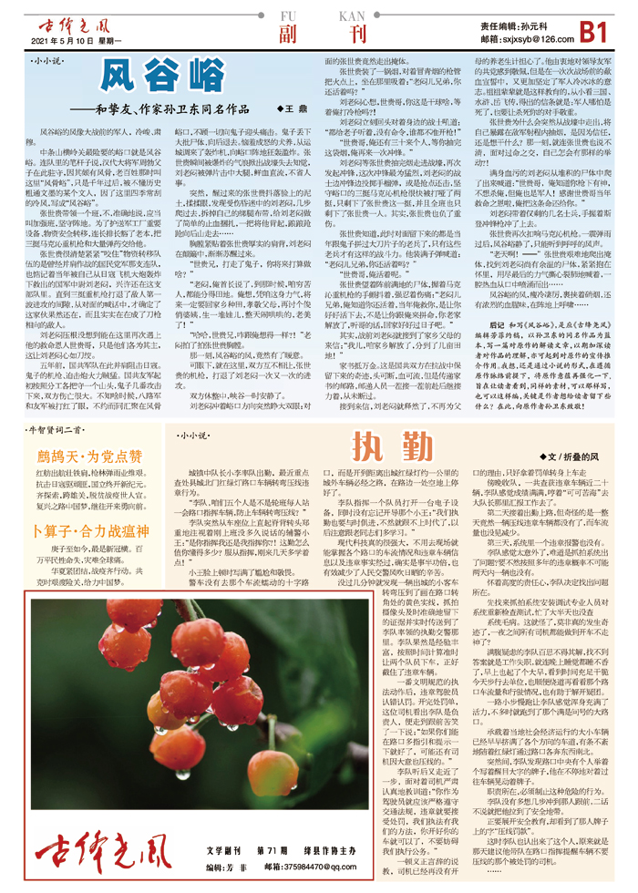 后记 和写《风谷峪》,是应《古绛尧风》编辑芳菲约稿,以孙卫东的同名作品为蓝本,写一篇对原作的解读文章,以期加深读者对作品的理解,亦可起到对原作的宣传推介作用。我想,还是通过小说的形式,在遵循原作脉络前提下,将原作意蕴再强化一下,旨在让读者看到,同样的素材,可以那样写,也可以这样编,关键是作者想给读者留下些什么?在此,向原作者孙卫东致敬!