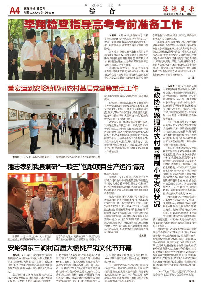 本报讯 5月22日,县委副书记、县长李翔先后到绛县中学、实验中学和绛县二中考点,实地检查指导高考考前各项准备工作。政府副县长、南樊镇党委书记张维华等陪同。